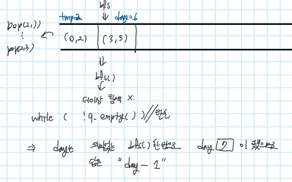 : 예제가 아래와 같이 들어온다면 아래의 토마토 일 수 변화과정으로 6일이 결과값으로 도출됨을 확인할 수 있다