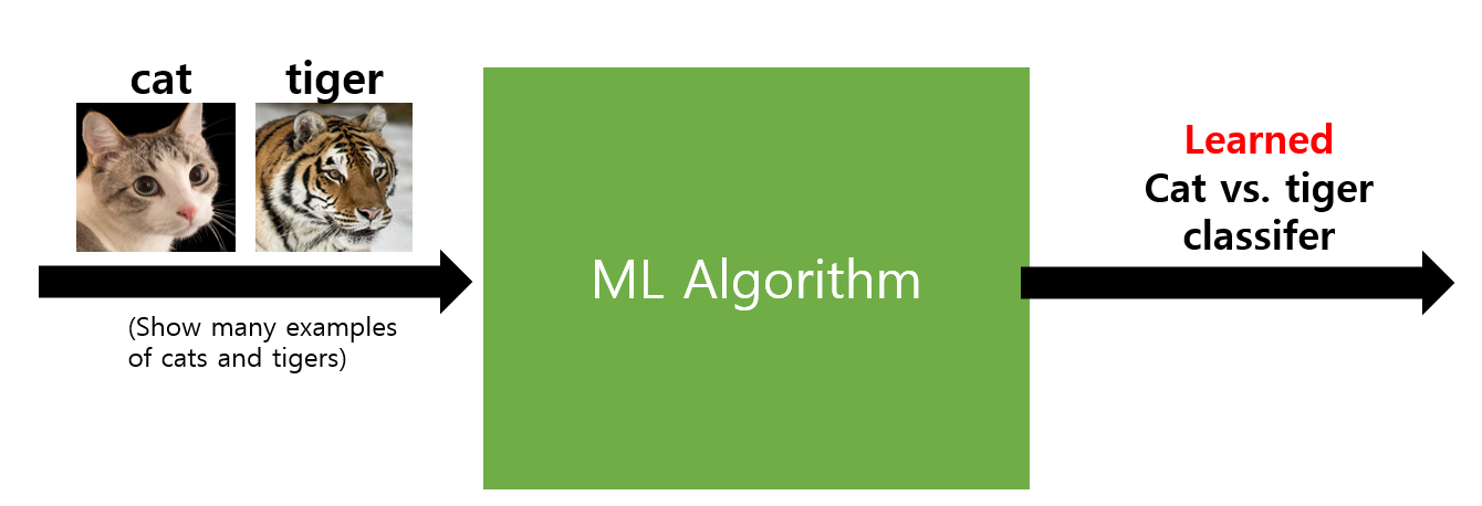 명시적인 규칙 없이 기계가 데이터로부터 학습하도록 하는 기술로, hard-coded(fixed) 규칙을 사용해 프로그램을 짜는 전통적인 컴퓨터 프로그래밍과는 구분되는 개념.