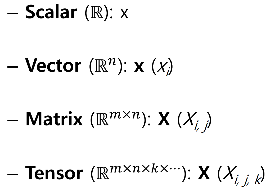 : Scalar는 실수 값, Vector는 n-dimensional로 표현 가능, Matrix 는 nxm, Tensors는 고차원의 matrix