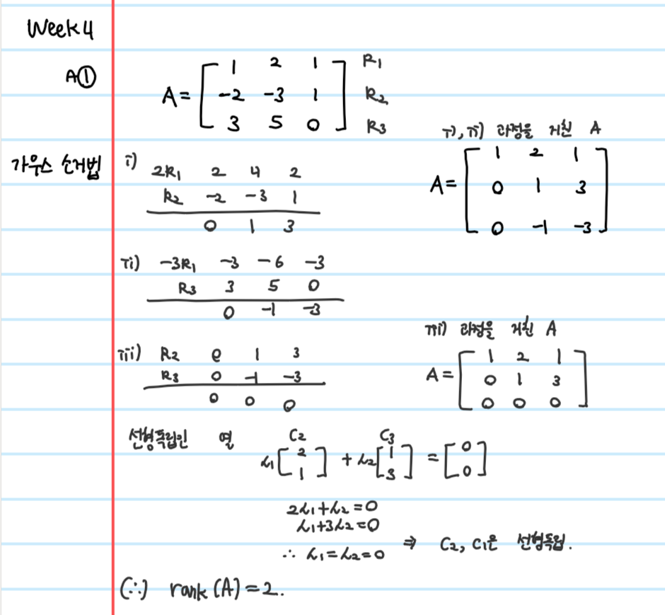 - 매트릭스 A의 rank는 벡터공간에서 생성된 차원을 말하는데 이는 칼럼에 의해 정해짐