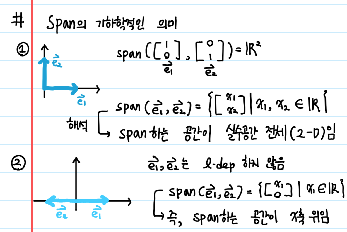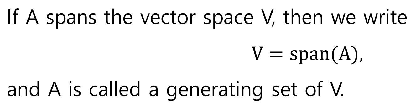 - A의 span이 basis vector로 이루어져 있을 경우 벡터 공간의 모든 벡터는 A 벡터들의 linear sum 즉 A의 span으로 표현 가능