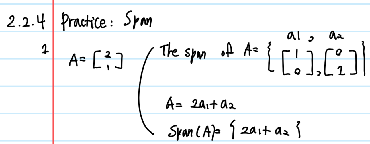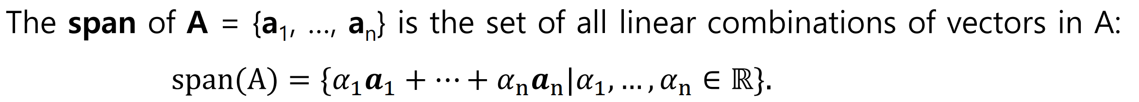 - A의 Span이란 A의 벡터들의 linear sum의 결과를 모아 놓은 것