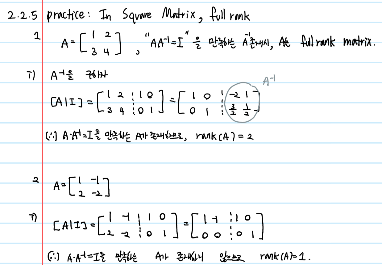 - 오직 정방행렬 A가 정칙행렬(invertible)일 경우에만 full rank가 가능하다