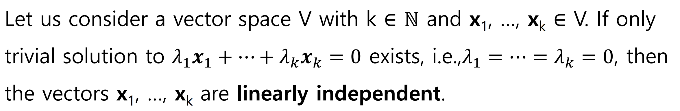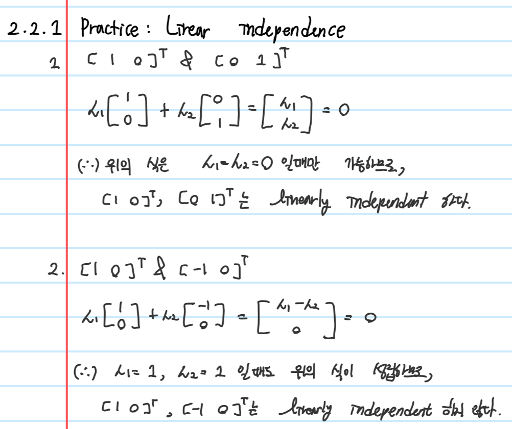 - 두 벡터가 2차원 상의 벡터일 경우 한 벡터가 다른 벡터의 scalar곱이 아닐 경우 lineary independent 함