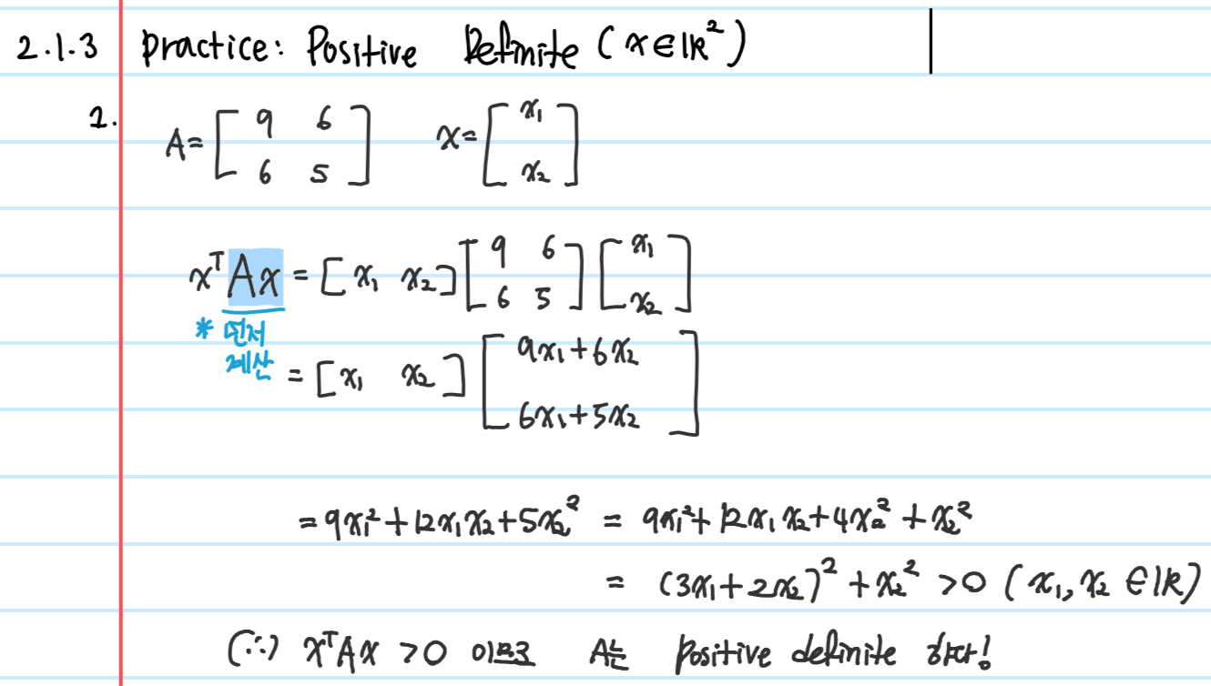 - Positive Definite definition : 대칭 행렬 A 가 아래의 조건을 만족 시, positive definite 하다고 한다