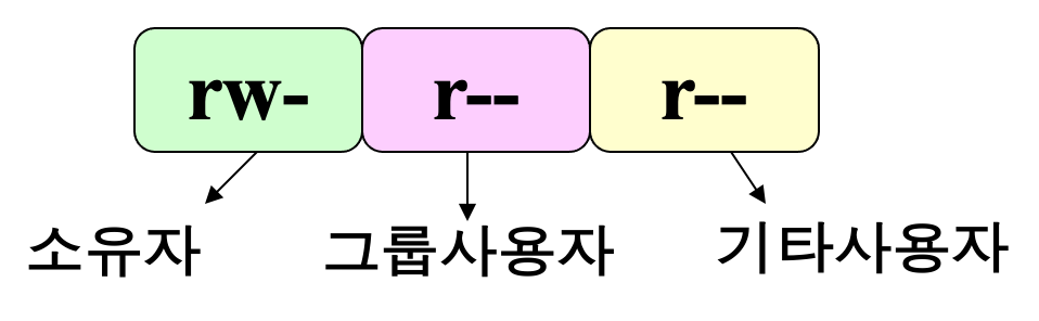 - 3개의 8진수를 사용하여 전체 접근 권한 표시