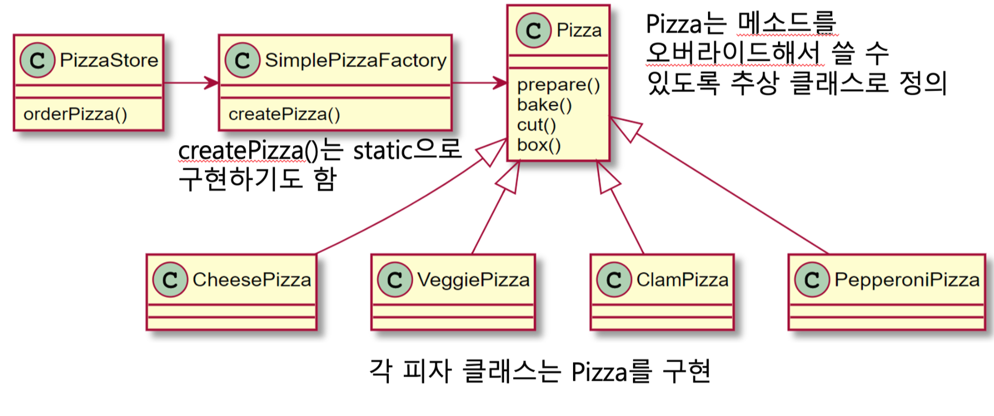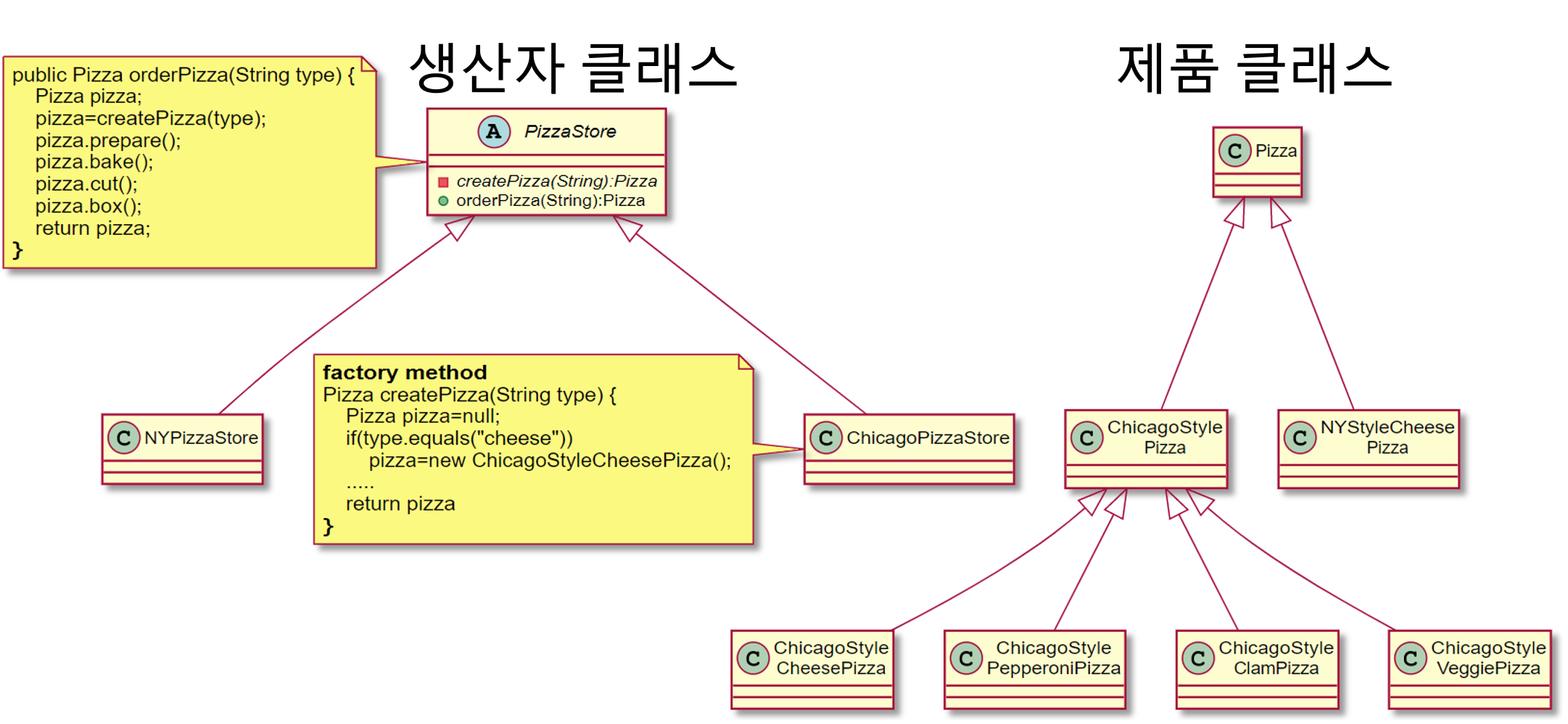 public abstract class PizzaStore { void prepareToBoxing(Pizza pizza) { pizza.prepare(); pizza.bake(); pizza.cut(); pizza.box(); } public Pizza orderPizza(String type) { Pizza pizza = createPizza(type); prepareToBoxing(pizza); return pizza; } // 팩토리 메소드 abstract Pizza createPizza(String type); } public class NYPizzaStore extends PizzaStore { Pizza createPizza(String type) { if type.equals("cheese")) { pizza = new NYStyleCheesePizza(); } else if (type.equals("pepperoni")) { pizza = new NYStylePepperoniPizza(); } else if (type.equals("clam")) { pizza = new NYStyleClamPizza(); } else if (type.equals("veggie")) { pizza = new NYStyleVeggiePizza(); } } } public class ChicagoPizzaStore extends PizzaStore { Pizza createPizza(String type) { if type.equals("cheese")) { pizza = new ChicagoStyleCheesePizza(); } else if (type.equals("pepperoni")) { pizza = new ChicagoStylePepperoniPizza(); } else if (type.equals("clam")) { pizza = new ChicagoStyleClamPizza(); } else if (type.equals("veggie")) { pizza = new ChicagoStyleVeggiePizza(); } } }