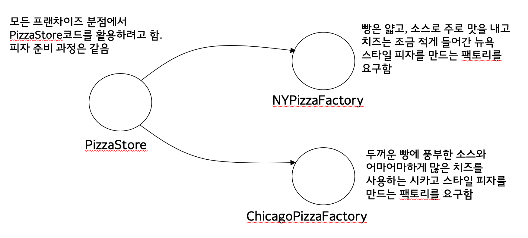 - SimplePizzaFactory 대신 세 가지 다른 팩토리를 PizzaStore에서 사용하도록 하면 됨
