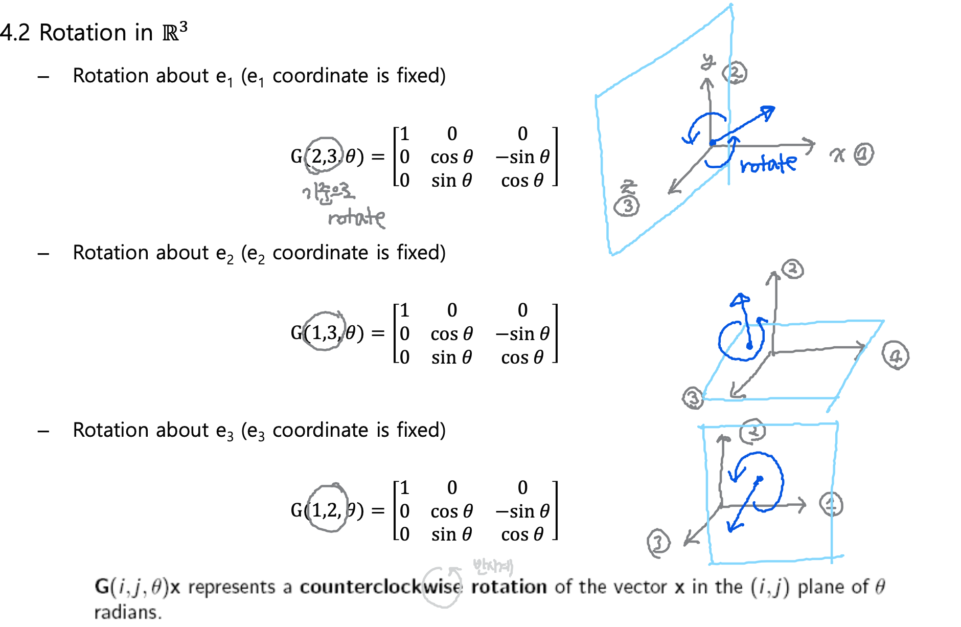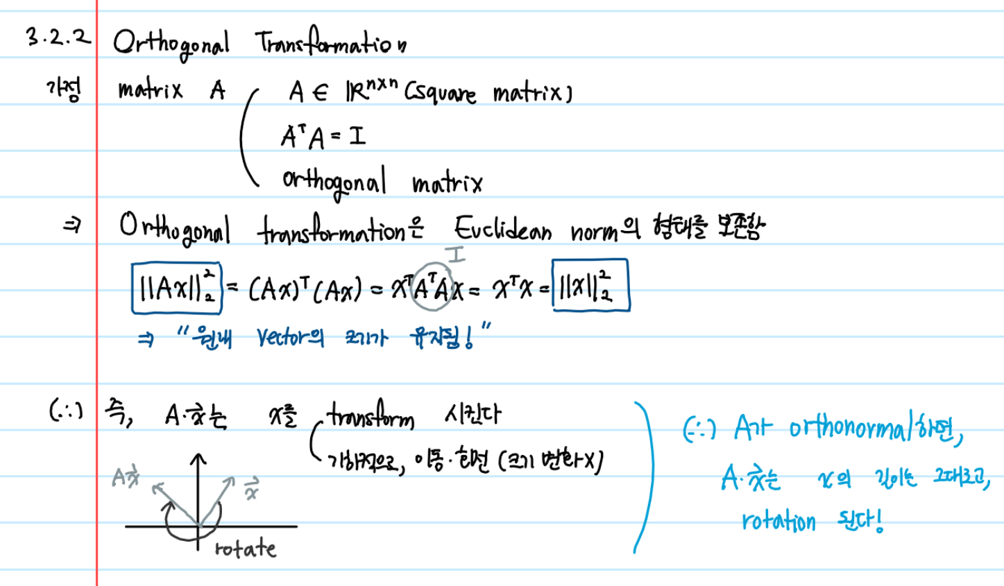 - 벡터 x에 orthogonal한 정방향 matrix를 곱할 경우 rotate됨