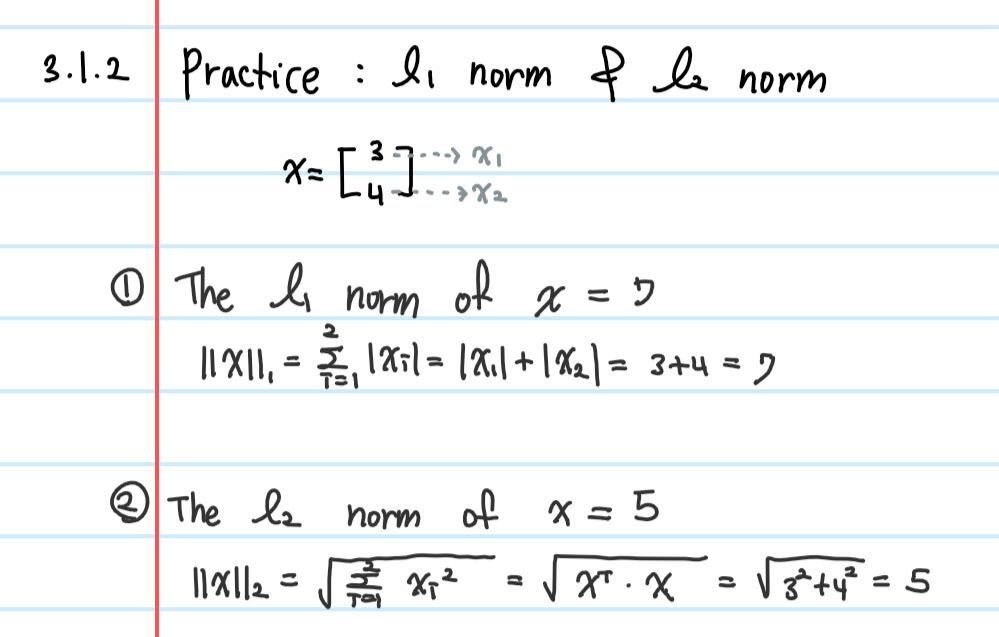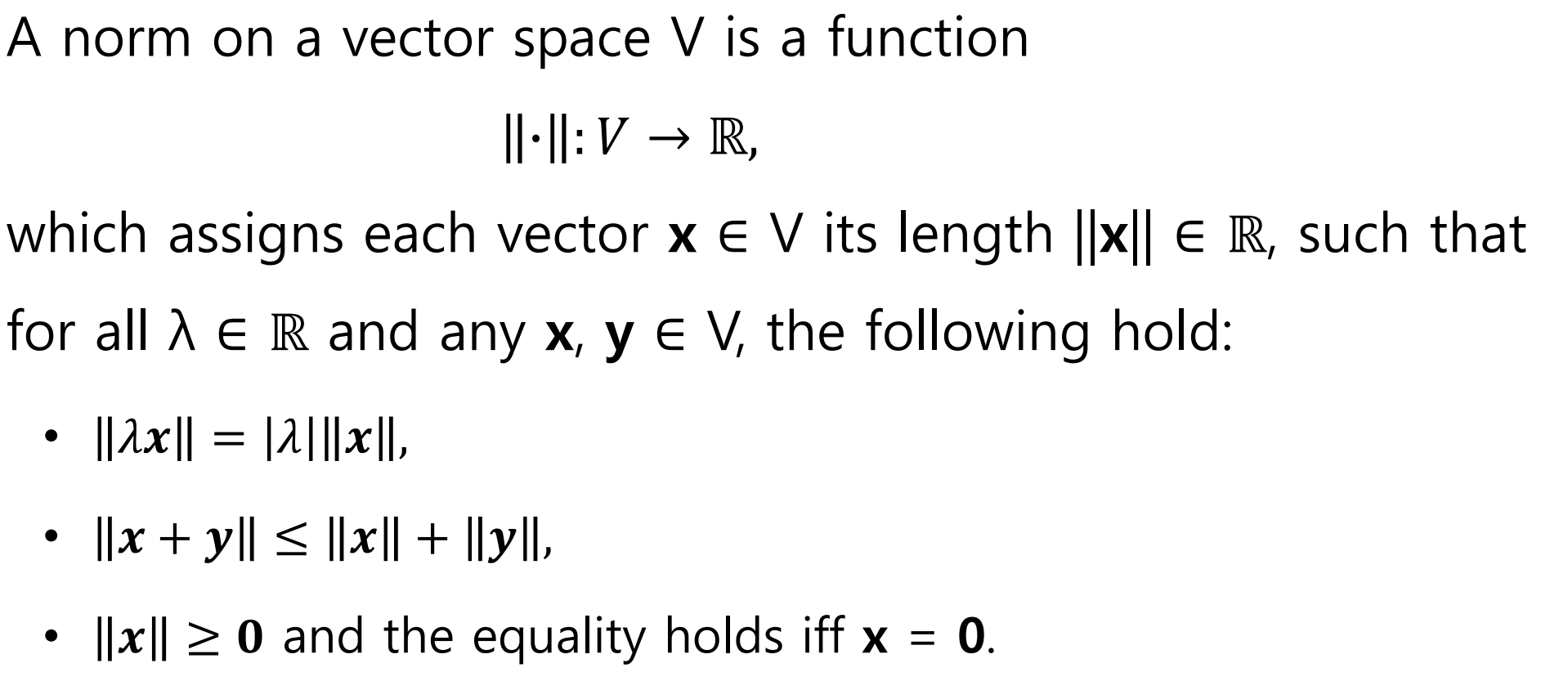 - Definition: 벡터 공간 위의 norm은 실수로 가는 mapping function임