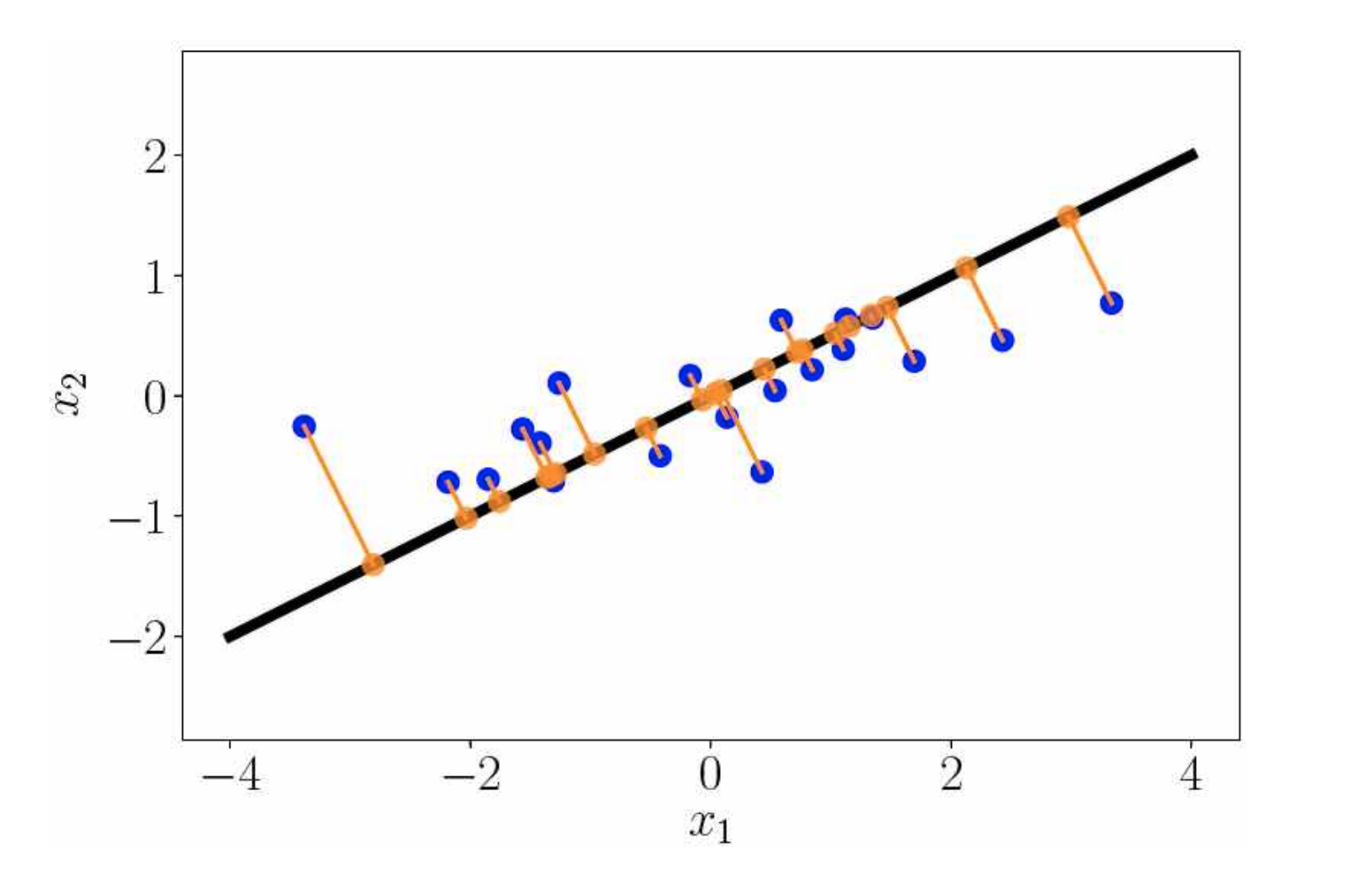 - 선형회귀에서는 데이터(점)와 직선이 x축의 수직으로 근사시키나 orthogonal projection의 경우 점과 직선이 직교하게 근사시킴