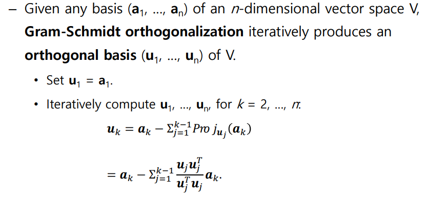 n차원 벡터 공간 V의 임의의 basis가 주어졌을 때, V의 orthogonal basis(u_1, ... , u_n)를 반복적으로 계산하는 방법