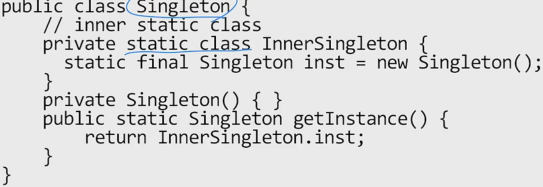 - getInstance()를 호출하면 내부에 있는 정적 클래스의 인스턴스를 생성해서 반환