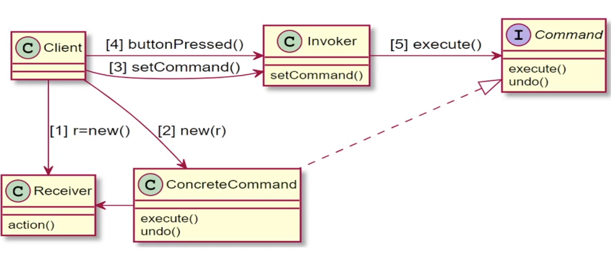 - 요구사항(요청, 명령)을 객체로 캡슐화시킴. 이를 이용해서 다른 요구사항을 지닌 클라이언트를 매개변수화 시킬 수 있고, 요구사항을 큐에 넣거나 로그로 남길 수 있으며 작업 취소(undo) 기능을 지원할 수도 있음