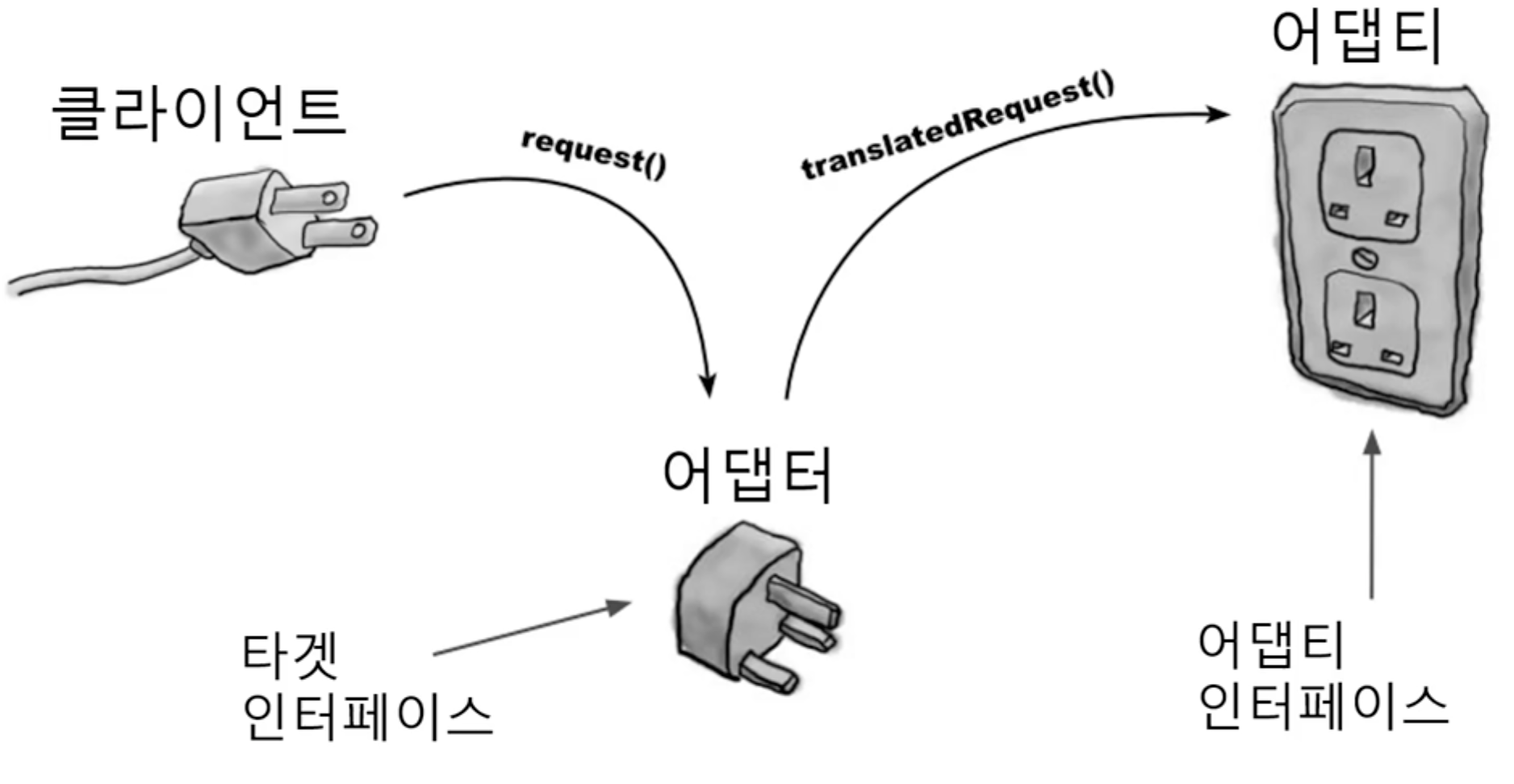 이 경우 어댑터는 클라이언트로부터 요청을 받아서 업체에서 제공하는 클래스에서 수용할 수 있는 형태로 변환시켜주는 중개인 역할을 함