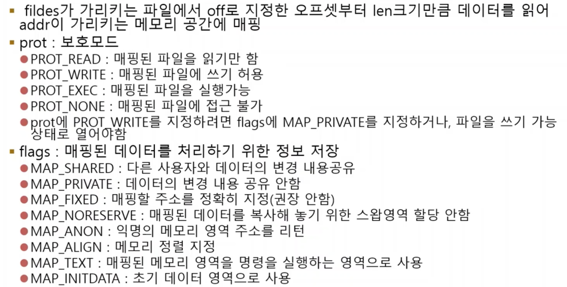 - mmap 함수로 메모리 매핑을 수행할 때 초기값을 설정한 보호모드를 mprotect 함수로 변경 가능