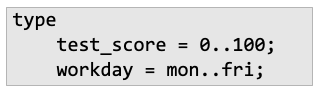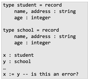 - strict name equivalence를 따른다고 하면, type A = B라고 선언할 경우 새로운 정의를 만든다고 봄