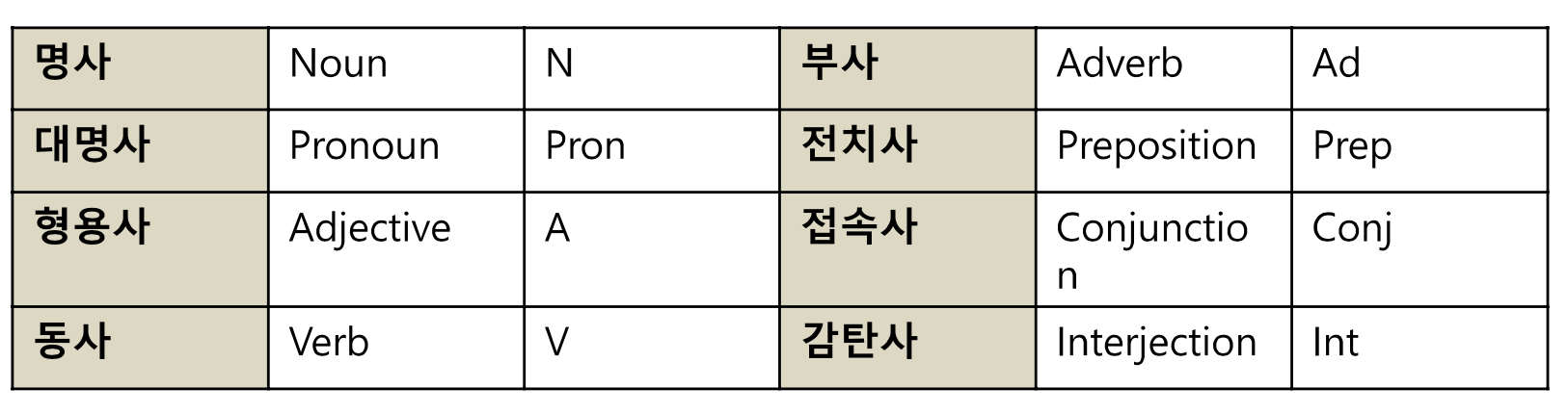 - 단어의 기능, 형태, 의미에 따라 나눈 것