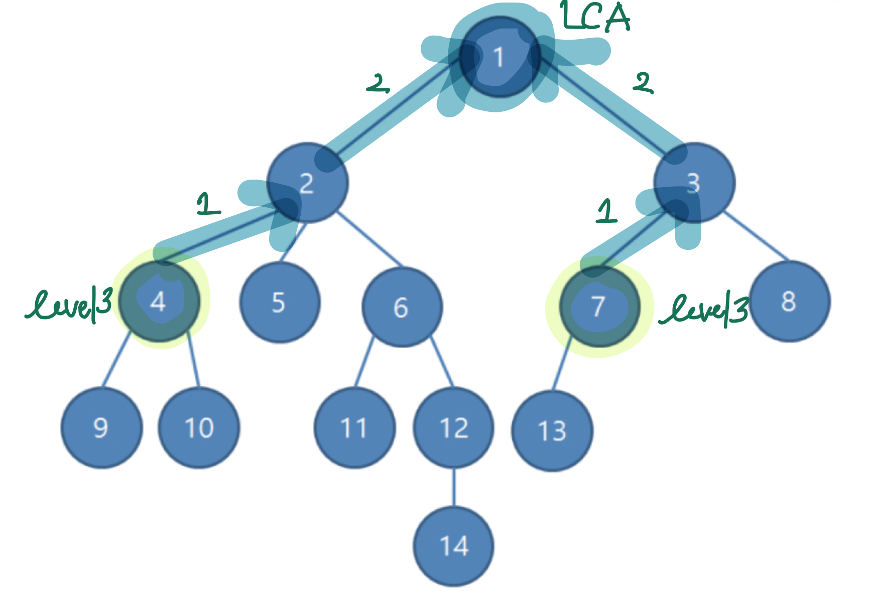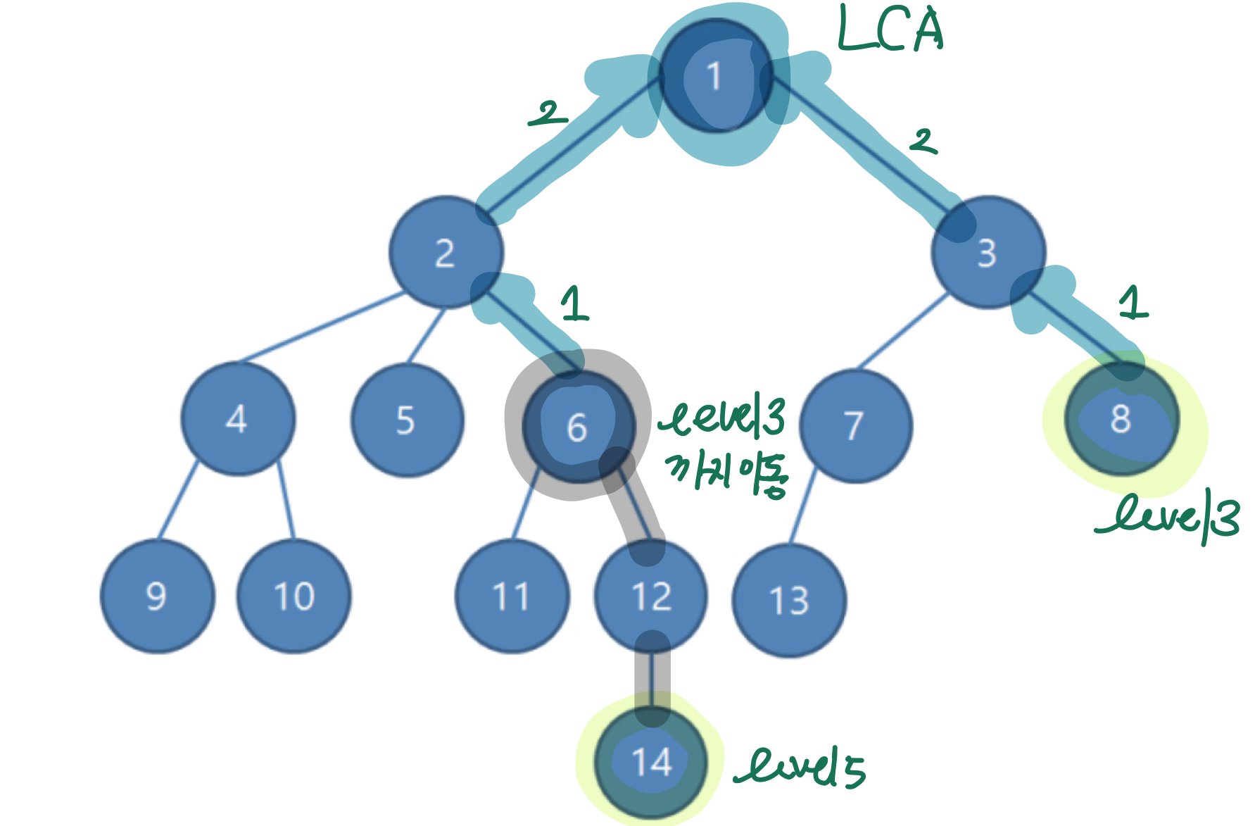 다른 예로는 노드 9, 14의 LCA는 2번 노드이며, 노드 3, 13의 LCA는 3번 노드이다