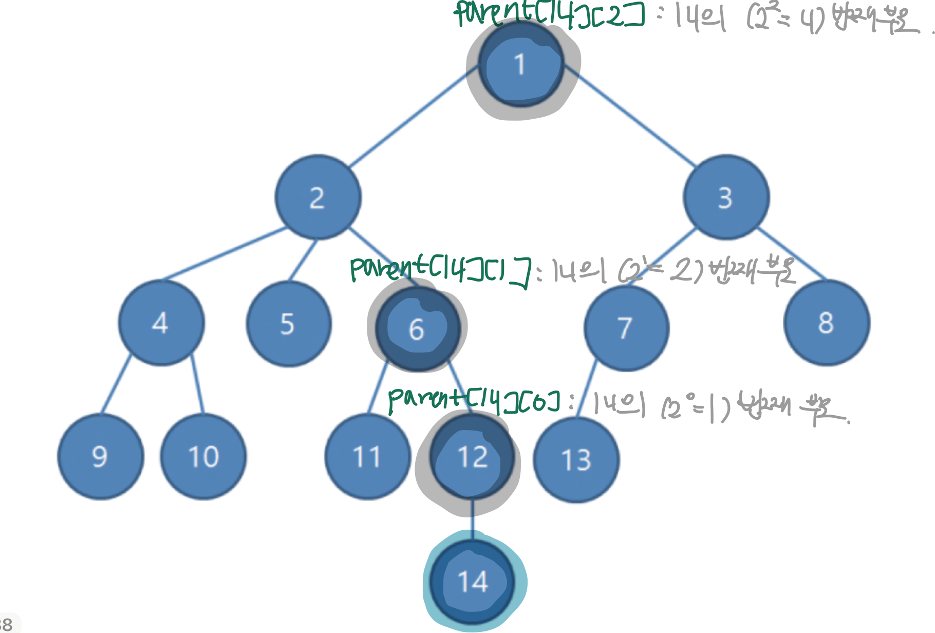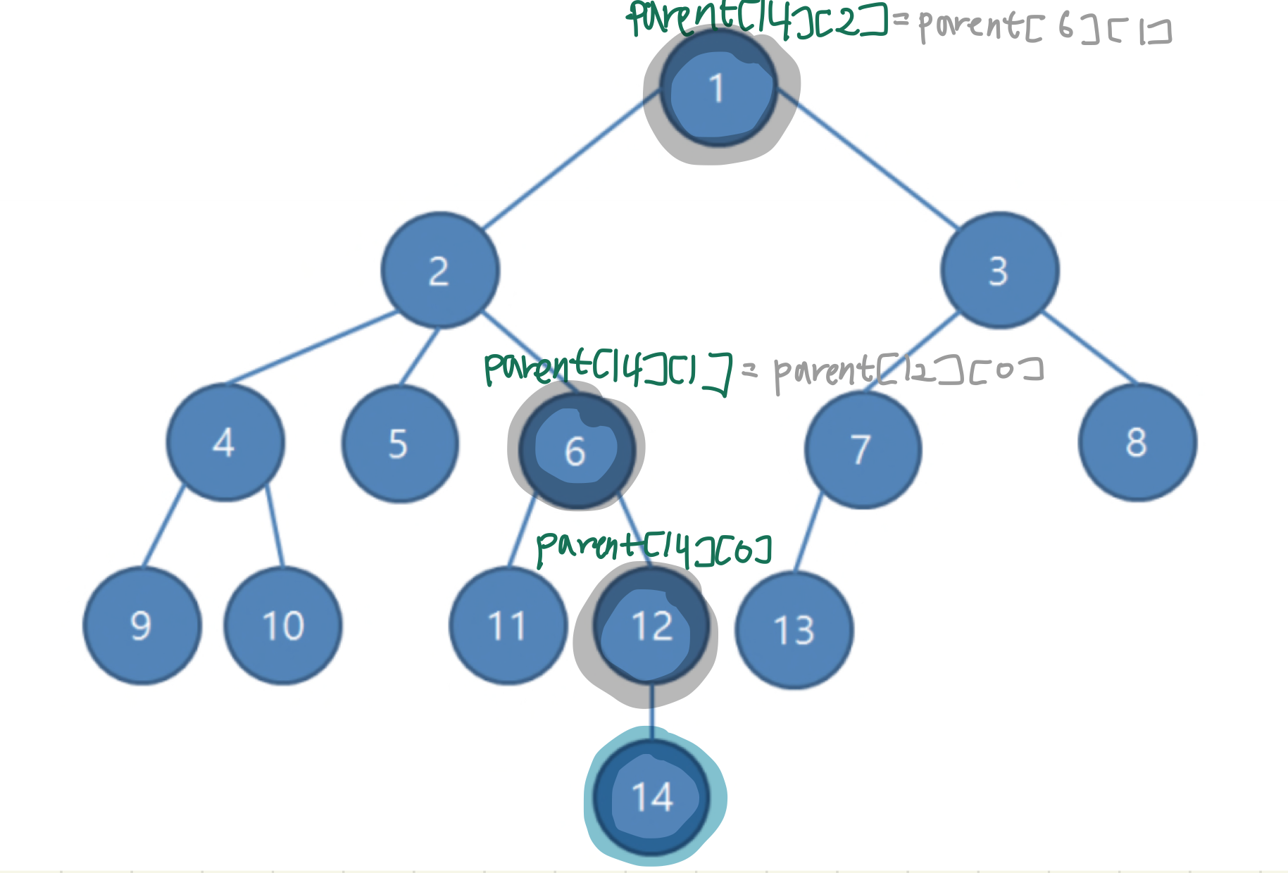 - Parent[x][k] = "x번 정점의 2^k번째 조상 노드의 번호"로 둔다
