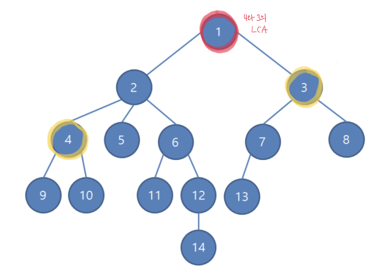 예를들어, 아래의 트리에서 노드 4와 3의 LCA는 1번 노드이다
