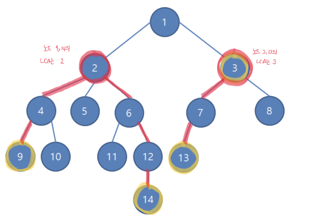 다른 예로는 노드 9, 14의 LCA는 2번 노드이며, 노드 3, 13의 LCA는 3번 노드이다